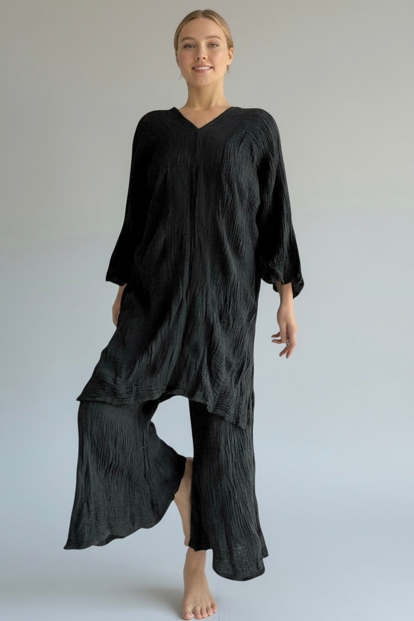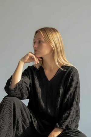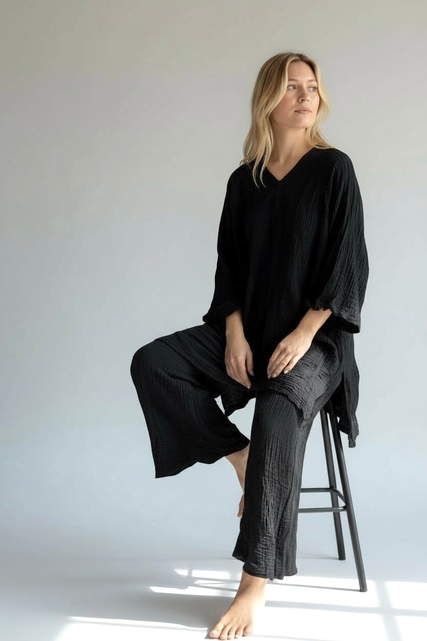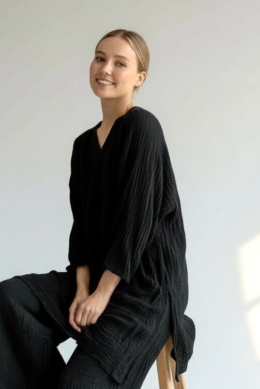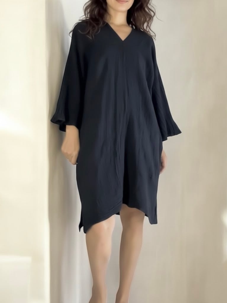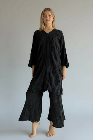 ストレスフリーな着心地で、家でも外でも自然体でいられるダブルガーゼ素材のチュニックドレス。ブラックカラーは、内なる強さを引き出し、自信をもたらします。高級感のあるデザインは、どんなシーンでも際立つ一着です。