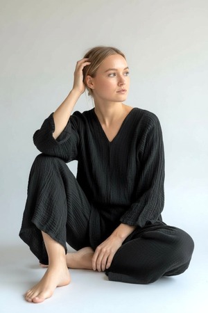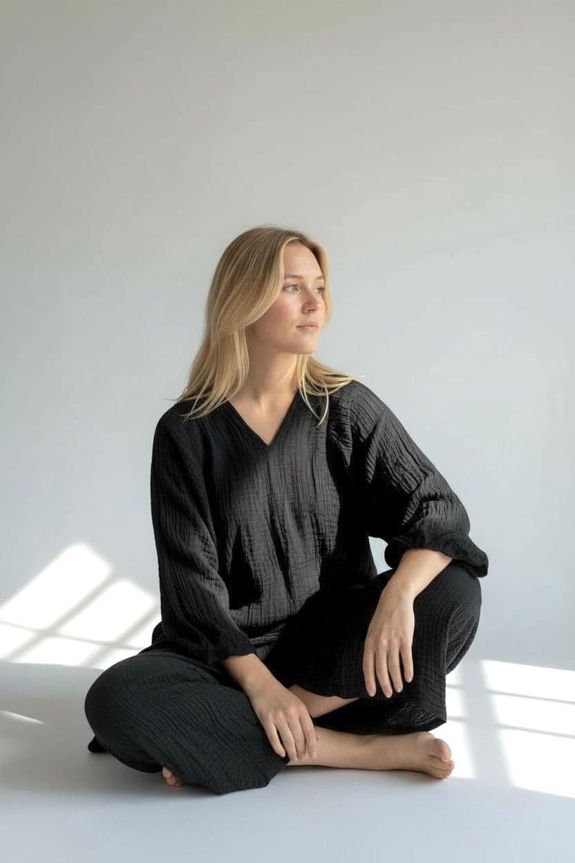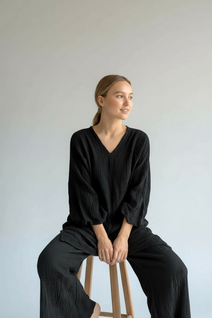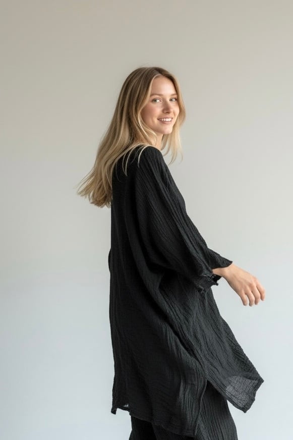 ストレスフリーな着心地で、家でも外でも自然体でいられるダブルガーゼ素材のチュニックドレス。ブラックカラーは、内なる強さを引き出し、自信をもたらします。高級感のあるデザインは、どんなシーンでも際立つ一着です。