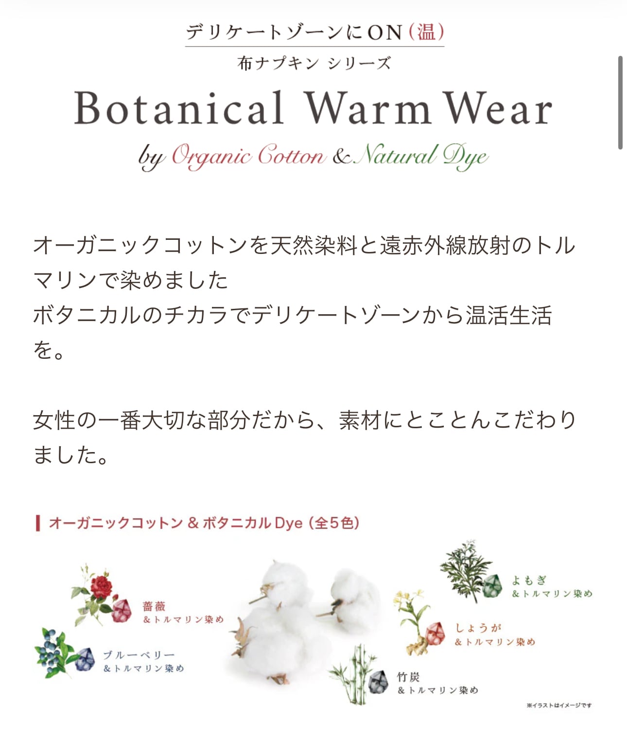 オーガニックコットンの布ナプキンは通常、ベージュや肌色の地味な色合いの物が程んどですが、Botanical Warm Wearシリーズの布ナプキンは「生姜」「バラ」「よもぎ」「ブルベリー」「竹炭」と女性の体を思いやる原料を使っています。