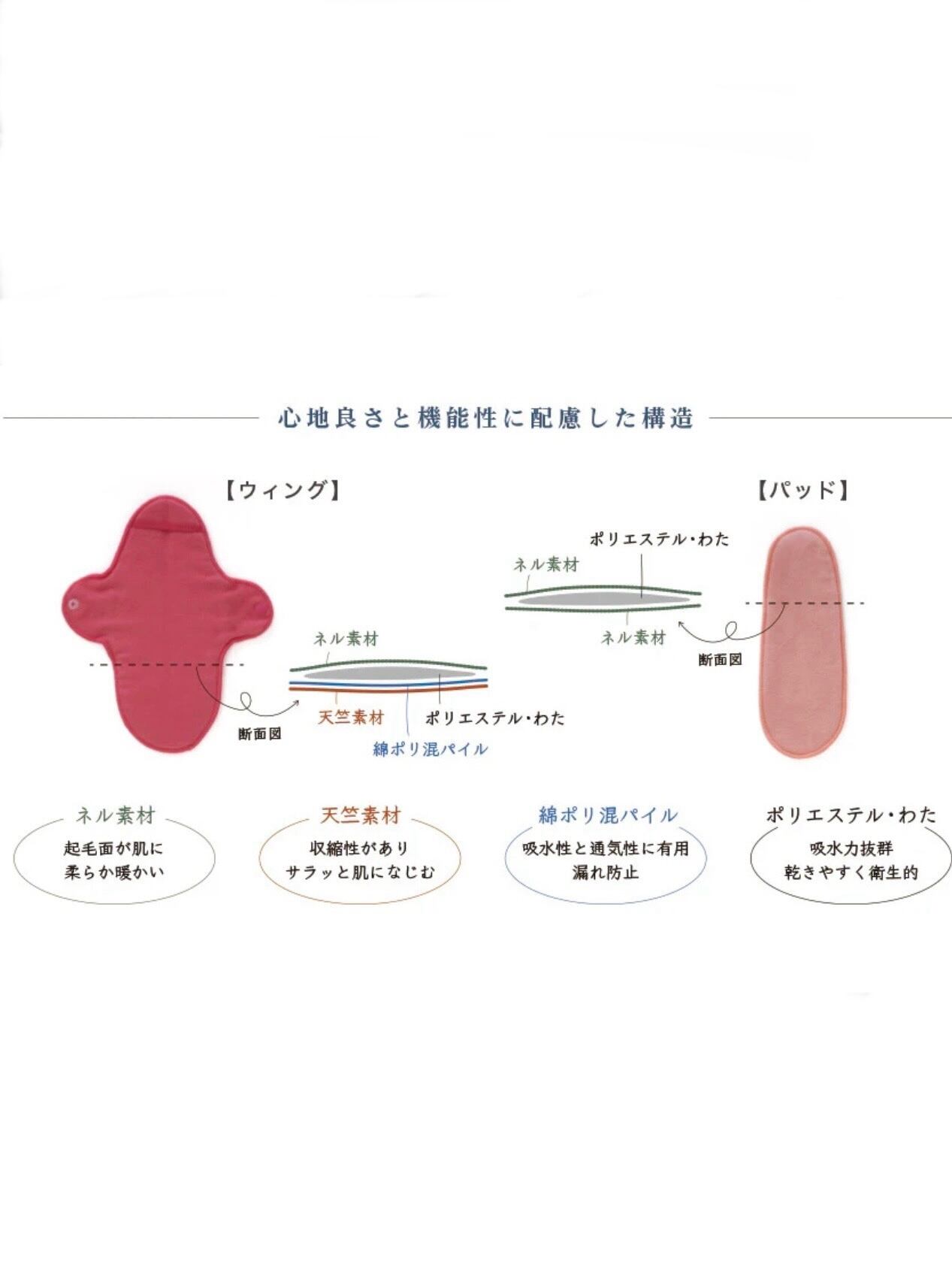 多い日はウィングの上に別売りのパッドを重ねてゴムて押えてお使い頂けると吸水量がアップします。多い日以外は、ウィングのみでご使用になれます。