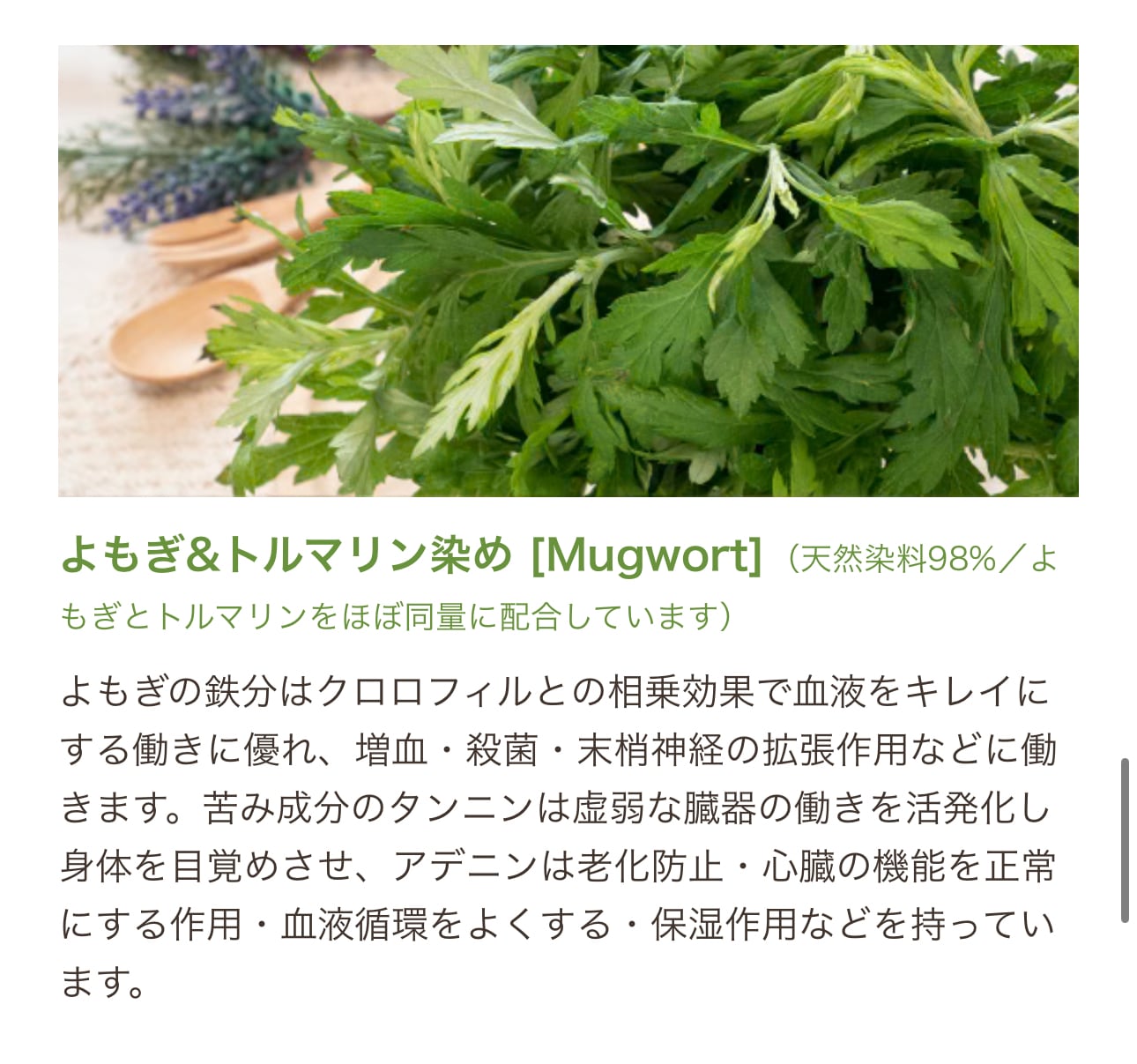 (天然染料98%/よもぎとトルマリンをほぼ同量に配合しています)