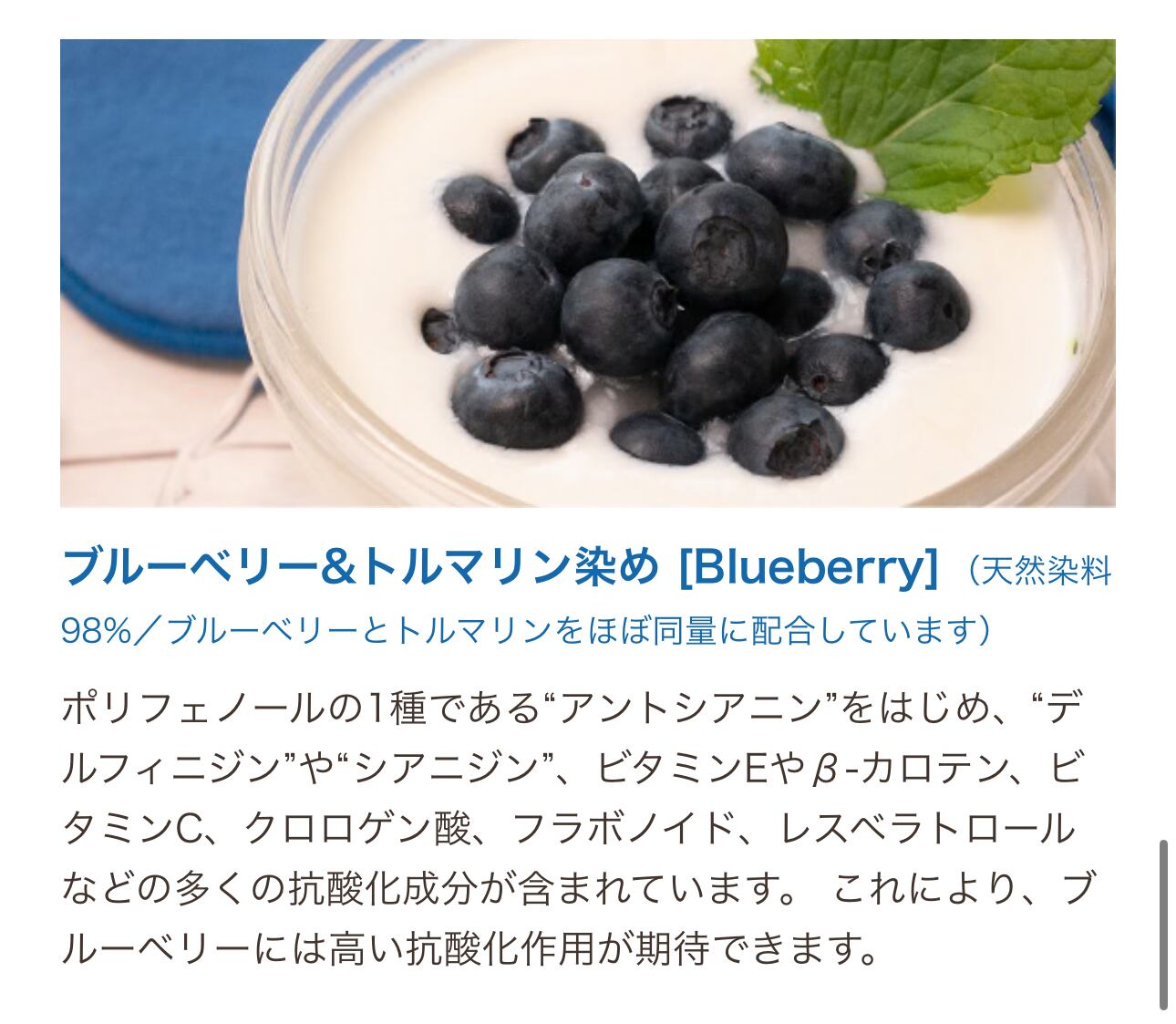 (天然染料98%/ブルーベリーとトルマリンをほぼ同量に配合しています)