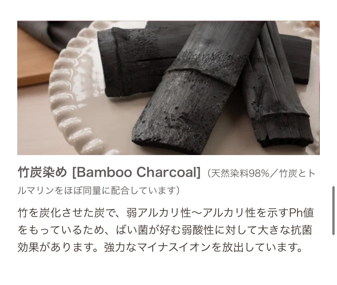 竹を炭化させた炭で、弱アルカリ性~アルカリ性を示すPh値をもっているため、ばい菌が好む弱酸性に対して大きな抗菌効果があります。強力なマイナスイオンを放出しています。