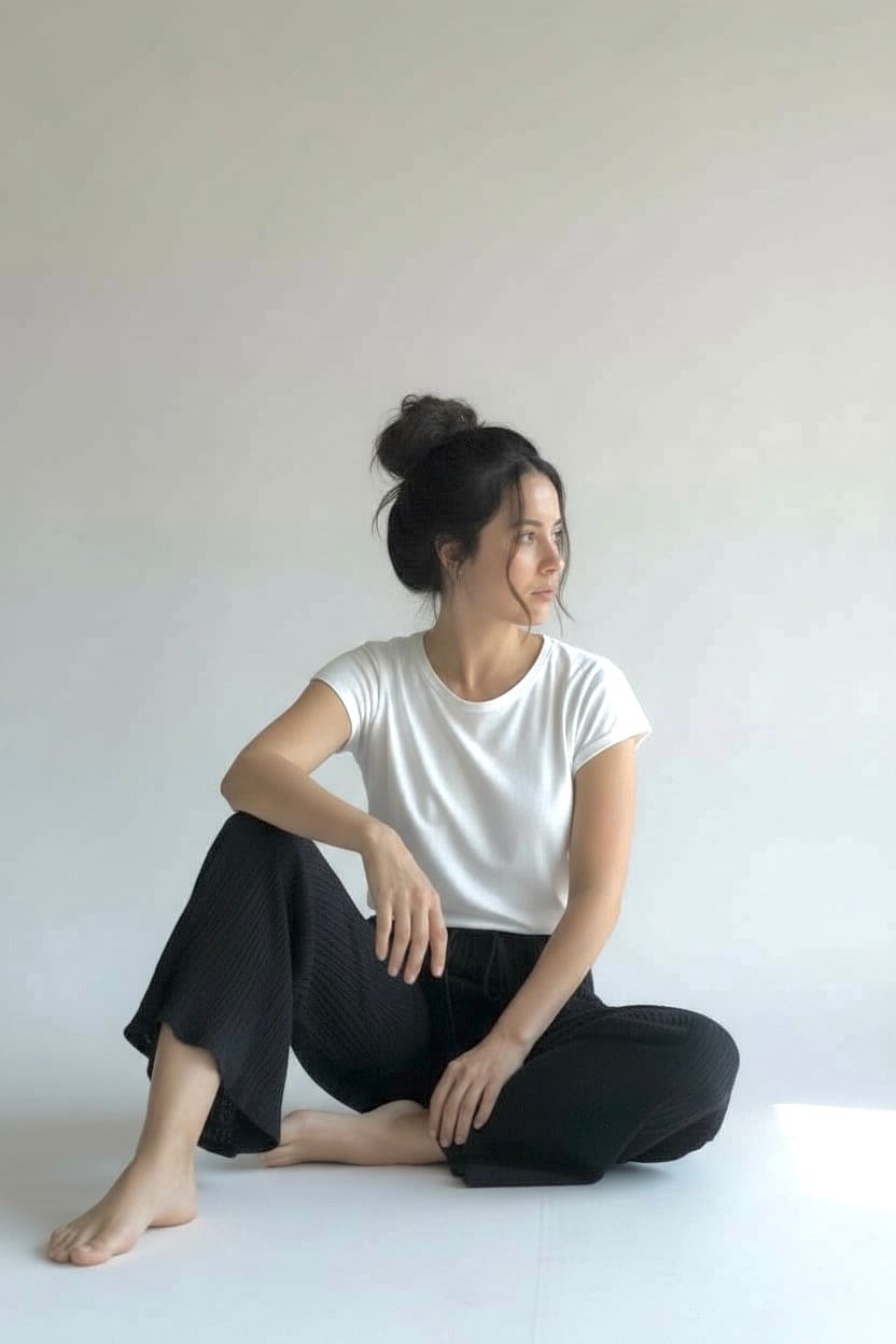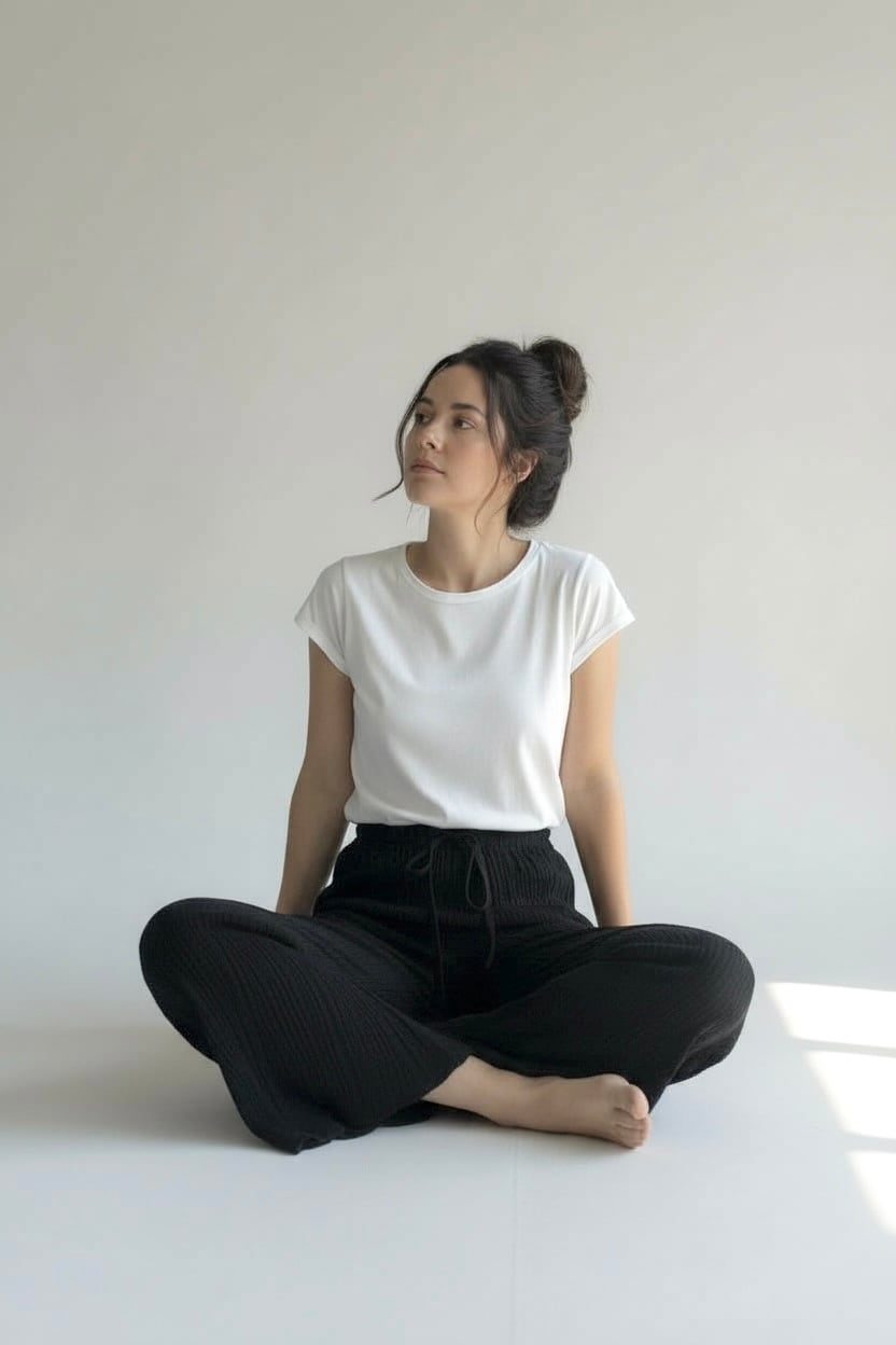 足を上げるアーサナの際は、裾で結んで頂くと快適にポーズに集中できます。