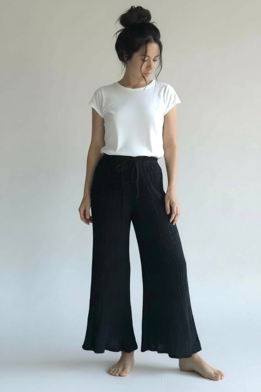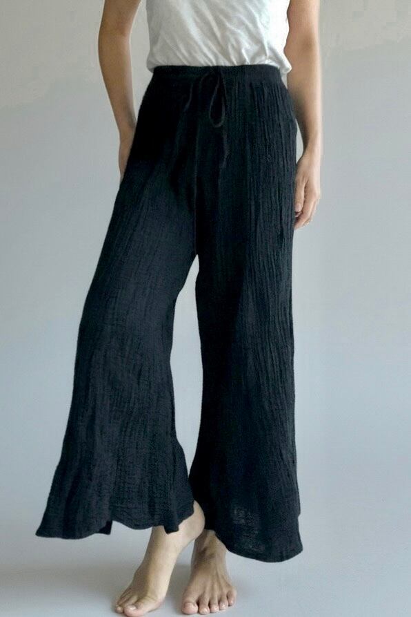 ダブルガーゼ素材で仕立てられた、自然な風合いが魅力のフレアーパンツ。