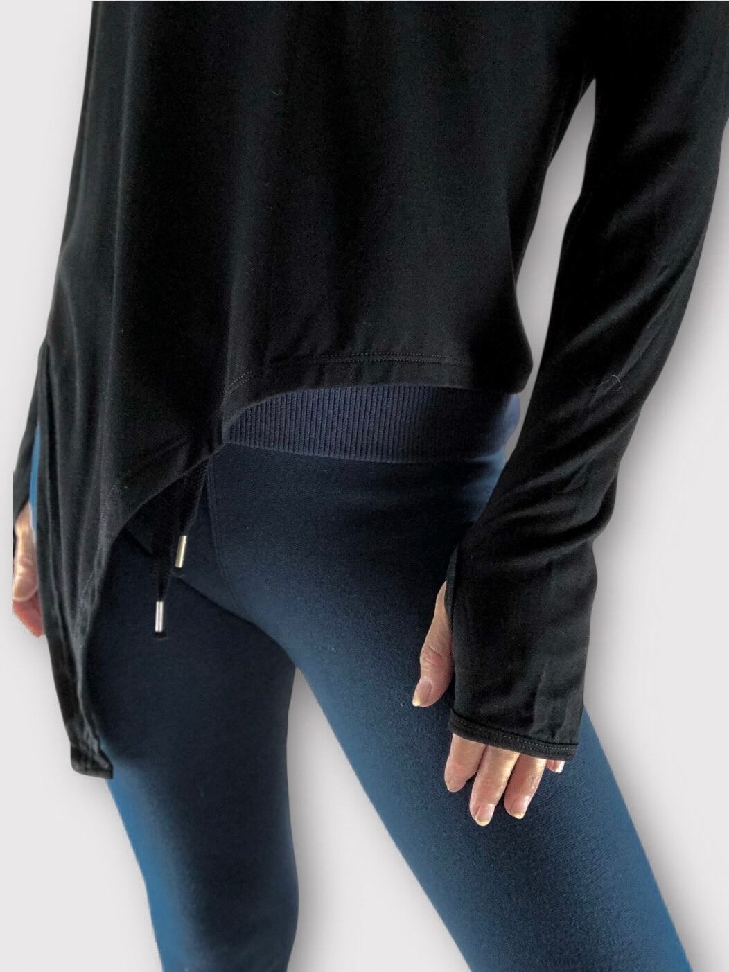 肌寒い日は、手首のホールに親指を通してあげると、温かさをキープしつつおしゃれに見せることができます。