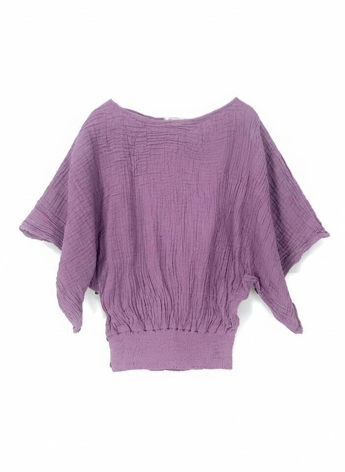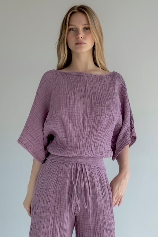 ストレスフリーな心地よさとリラックス感を兼ね備えたダブルガーゼ素材を使用したボートネックトップ。モーブカラーは、女性ならではの優しさと癒し感じさせ、安らぎのエネルギーを与えてくれます。