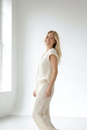 ダブルガーゼ素材で仕立てられた、自然な風合いが魅力のフロントボタンVネックシャツ。