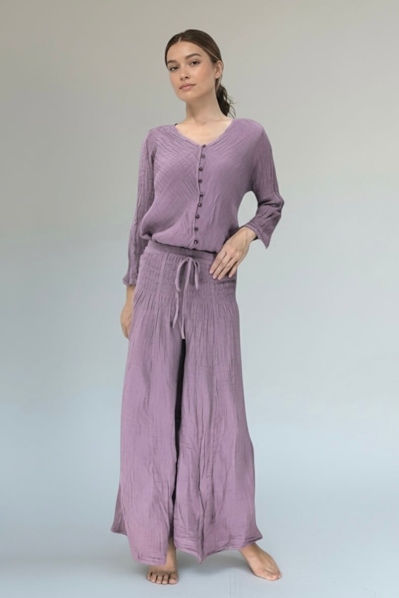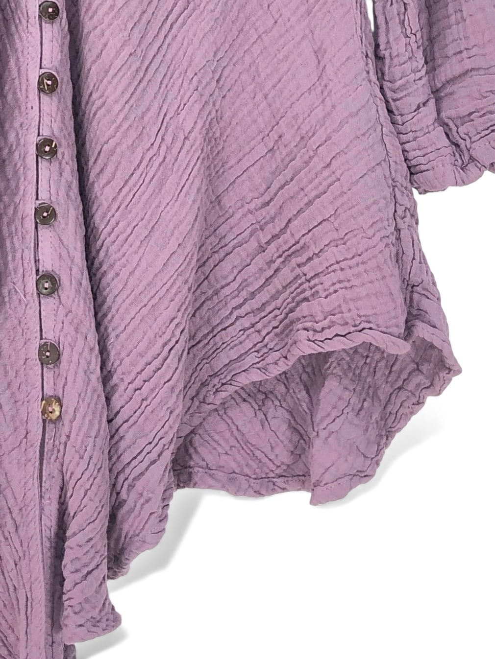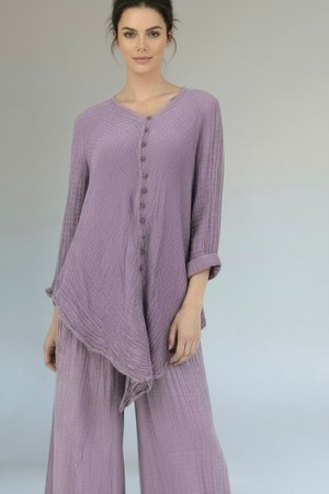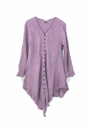 ストレスフリーな心地よさとリラックス感を兼ね備えたダブルガーゼ素材を使用したフロントボタンVネックシャツ長袖。モーブカラーは、女性ならではの優しさと癒し感じさせ、安らぎのエネルギーを与えてくれます。
