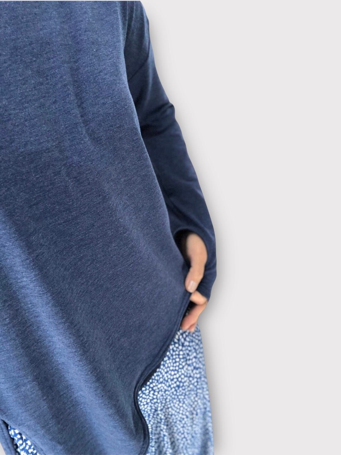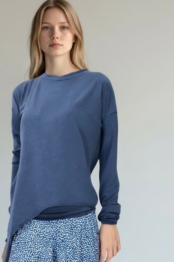スタイリッシュかつ快適な着心地を追求したサイドスリットカットソー。爽やかさあふれるデニムブルーの深い青色は心地よい着心地を提供し、日常使いから特別な日まで幅広いシーンで活躍するアイテムです。